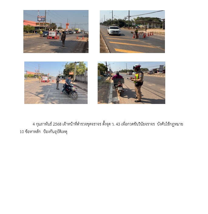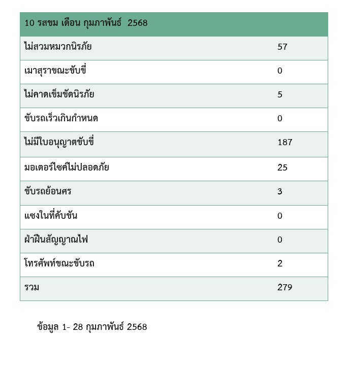 ผลการปฏิบัติงานจราจร ก.พ. 68 28 กุมภาพันธ์ 2568 โดย akatamnuai / ผลการปฏิบัติราชการงานจราจร เดือนกุมภาพันธ์ 2568 ภาพลักษณ์งานจราจร ประจำเดือน 1- 28 กุมภาพันธ์ 2568 การบังคับใช้กฎหมาย สถิติการจับกุม 10 ข้อหาหลัก ห้วง 1 -28 กุมภาพันธ์ 2568 ตรวจสอบเหตุเบื้องต้น อำนวยความสะดวกการจราจรงานพิธีพระราชทานเพลิงสรีรสังขารพระครูธรรมคุณาทร (หลวงปู่สูนย์ จนฺทวณฺโณ) จิตอาสาจราจร สถิติการตรวจยึดรถงานจราจร ประจำเดือน 1- 28 กุมภาพันธ์ 2568