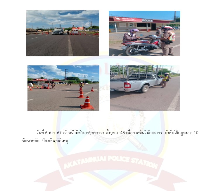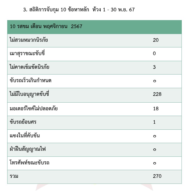 ผลการปฏิบัติงานจราจร เดือน พ.ย. 67 30 พฤศจิกายน 2567 โดย akatamnuai / ผลการปฏิบัติราชการงานจราจร สภ.อากาศอำนวยเดือน พฤศจิกายน 2567 ภาพลักษณ์งานจราจร ประจำเดือน พฤศจิกายน 2567 การบังคับใช้กฎหมาย จิตอาสา ตรวจสอบเหตุเบื้องต้น ตรวจร้านซ่อมในพื้นที่ อำนวยความสะดวกการจราจรแก่หน่วยงานข้างเคียง สถิติการจับกุม 10 ข้อหาหลัก ห้วง 1 – 30 พ.ย. 67 สถิติการตรวจยึดรถงานจราจร ประจำเดือนห้วงวันที่ 1 – 30 พฤศจิกายน 2567