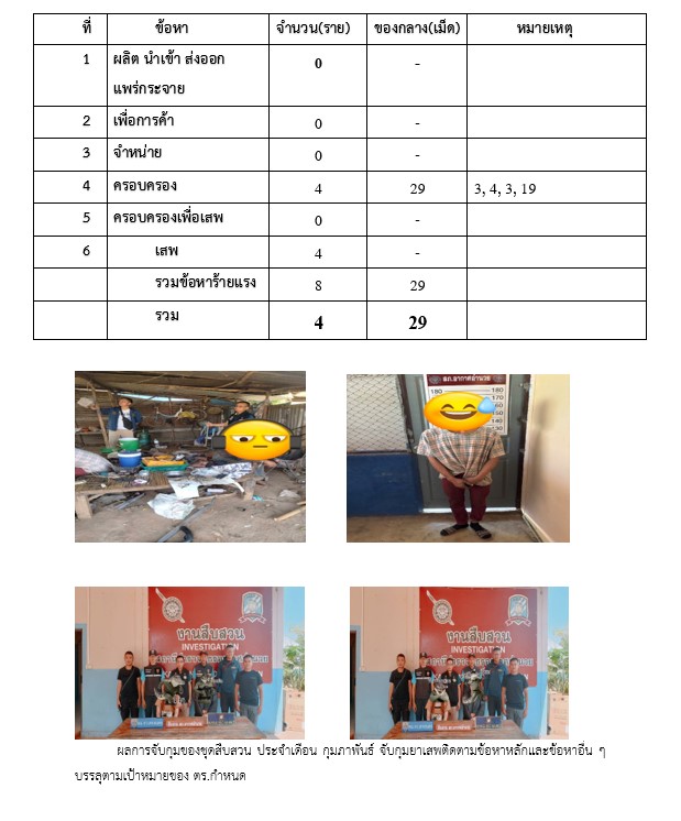 ผลการปฏิบัติงานสืบสวน ก.พ. 68 28 กุมภาพันธ์ 2568 โดย akatamnuai / ผลการปฏิบัติราชการงานสิบสวน เดือนกุมภาพันธ์ 2568 ประชุมวางแผนการปฏิบัติหน้าที่ ผลการจับกุม ห้วง 1 – 28 กุมภาพันธ์ 2568 ค้นหาผู้เสพตามโครงการแก้ปัญหายาเสพติด สกลนครโมเดล ปิดล้อมตรวจค้น รักษาความปลอดภัยงานบุญประจำปี