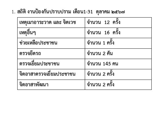 วันที่ 1-31 ตุลาคม 2567 งานป้องกันปราบปรามก่อนออกปฏิบัติหน้าที่แต่ละวัน ต้องเรียกแถวสายตรวจรถ